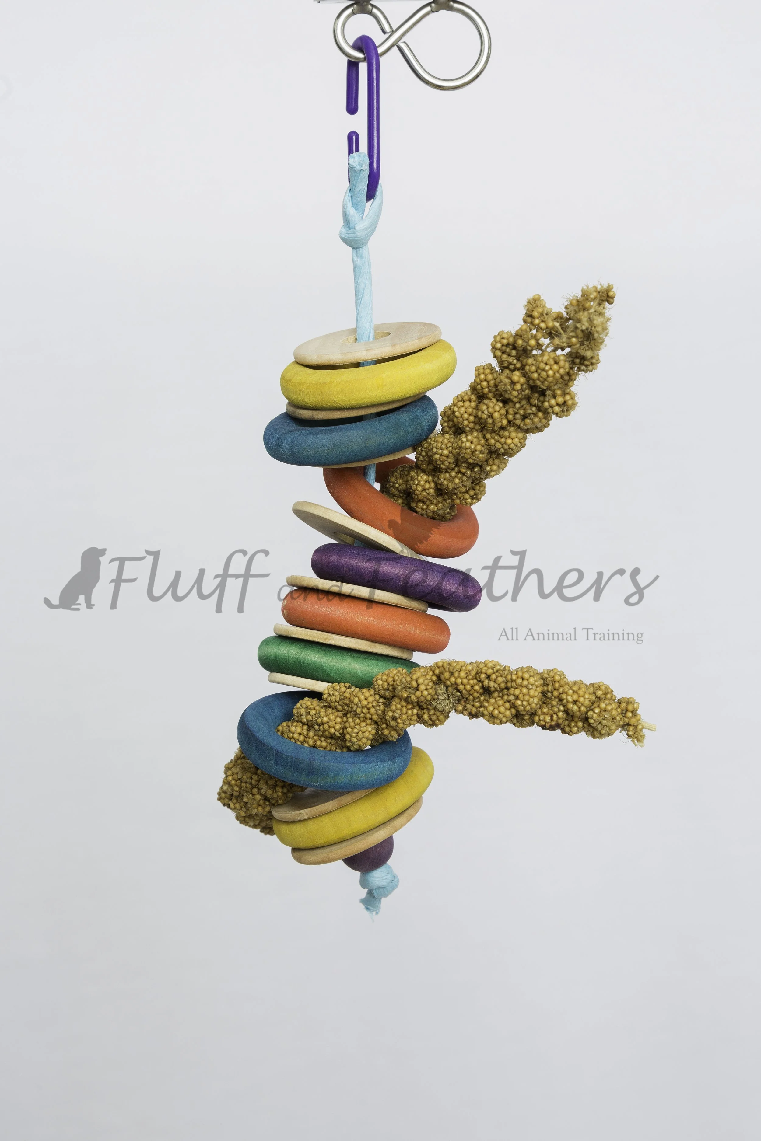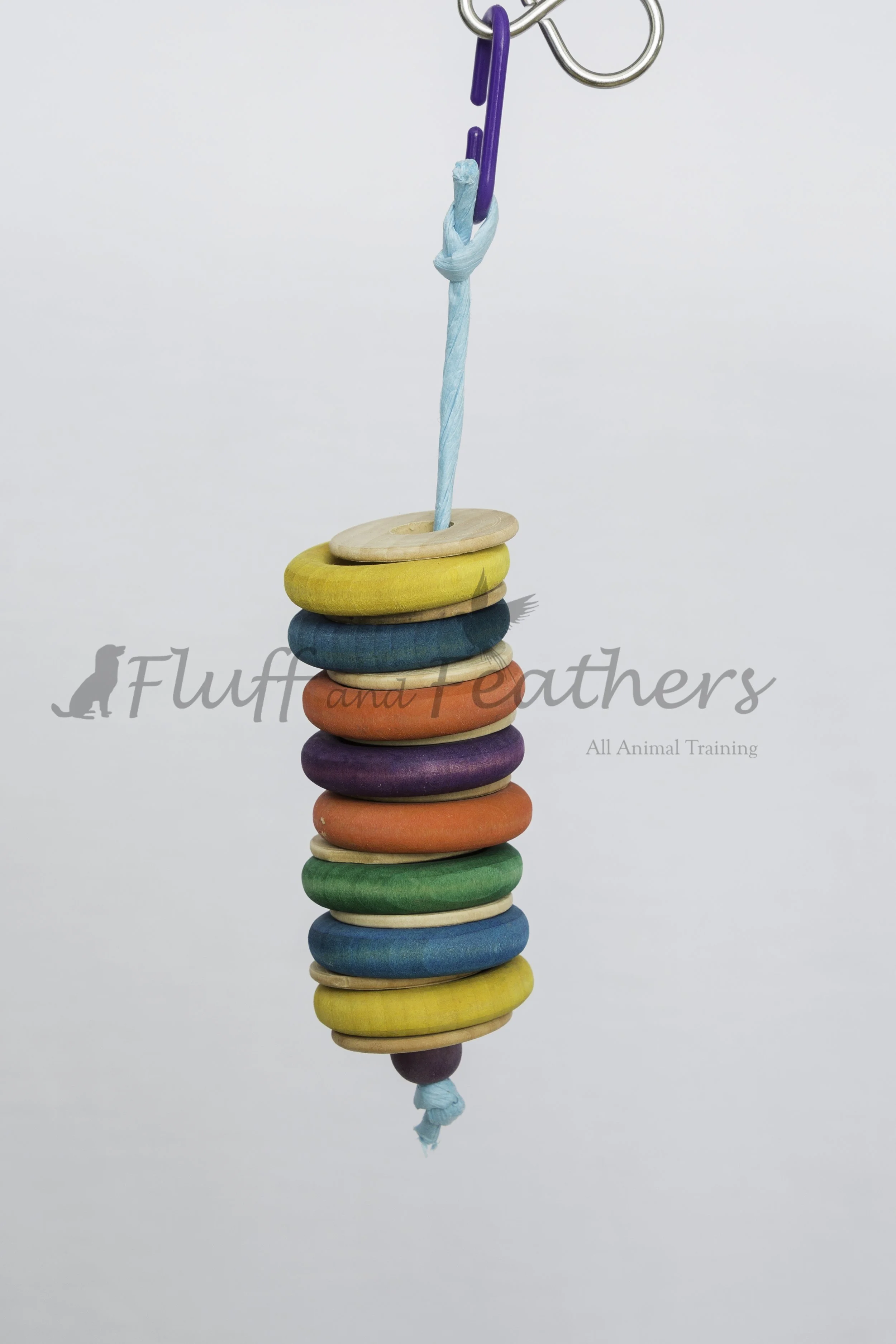 I thought of this toy design based off of my cockatoo who loves foam and wood! This is his favorite toy, despite his size ad the toy’s size. The foam dice are easy to poke holes into using a screw driver or scissors to hold your bird’s favorite food items. Remember that smaller holes and smaller food items make it harder for your bird. Do not be afraid to add depth to hiding your bird’s food within, as the deeper you put the food, the more challenging it is for your bird, and the longer the activity will last! This is a handmade product here in the USA by a professional trainer where quality, safety, and behavioral modification are our number one priority!